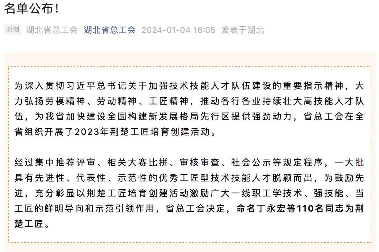 1月4日,湖北省總工會(huì)公布2023年“荊楚工匠”人選名單,中國(guó)船舶武漢船機(jī)特種機(jī)械部羅杰榮獲“荊楚工匠”稱號(hào)。